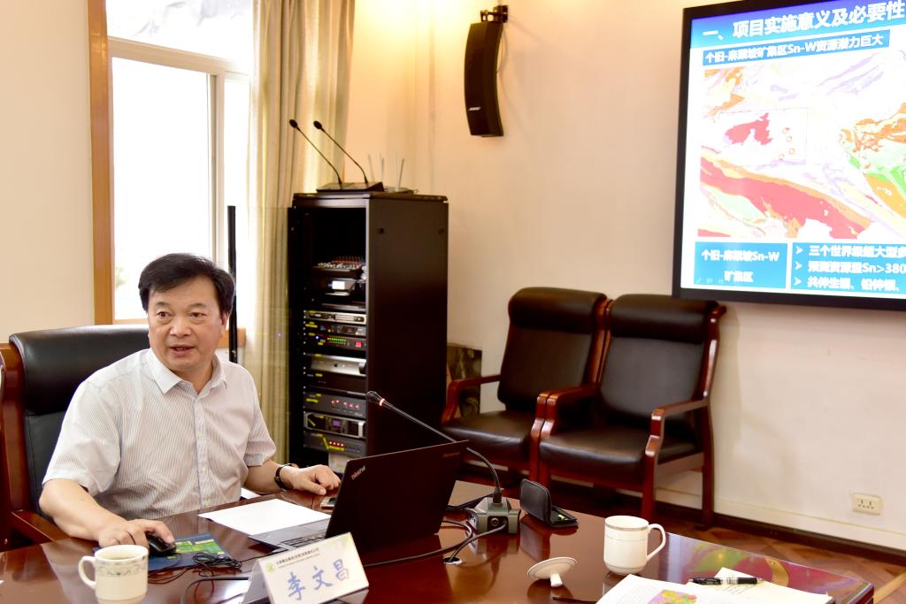 “錫是國家戰略性礦產資源,錫資源安全意義重大;研究各種類型侵入巖與三稀礦產的成礦關系;對磁鐵礦、方解石、石英等礦物進行物性標型特征和化學標型特征進行研究,建立礦物學找礦模型。”李文昌從項目實施意義和必要性、項目研究內容和設想等方面對《云南省個舊-麻栗坡礦集區多類型多期次錫鎢成礦規律及增儲》項目進行詳細介紹。并就“個舊錫、銅多金屬礦床構造-巖漿耦合成礦系統及找礦增儲”、“礦集區化學探測和成礦預測”等5個研究課題進行說明。