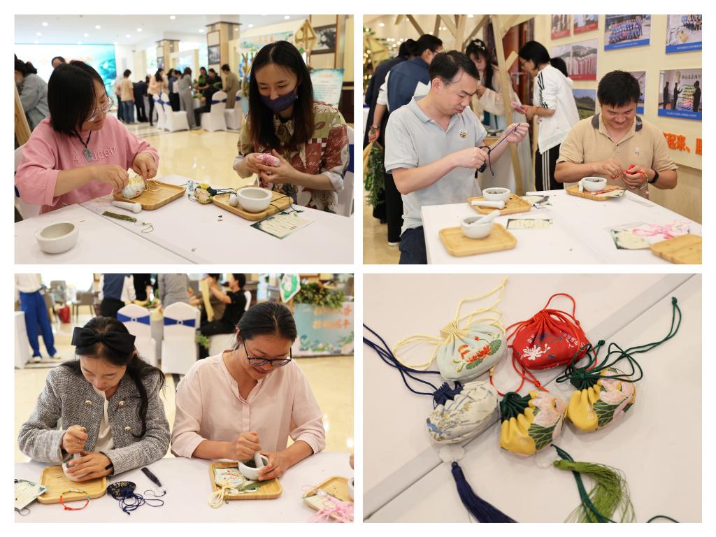 香囊制作現場,大家選擇自己喜歡味道的香料進行手工制作,將香料裝到藥罐里搗碎填充到香囊袋中、掛上彩繩……不一會的功夫,在一雙雙靈巧的手下,五顏六色、樣式各異的香囊就制作完成了,現場暗香涌動。