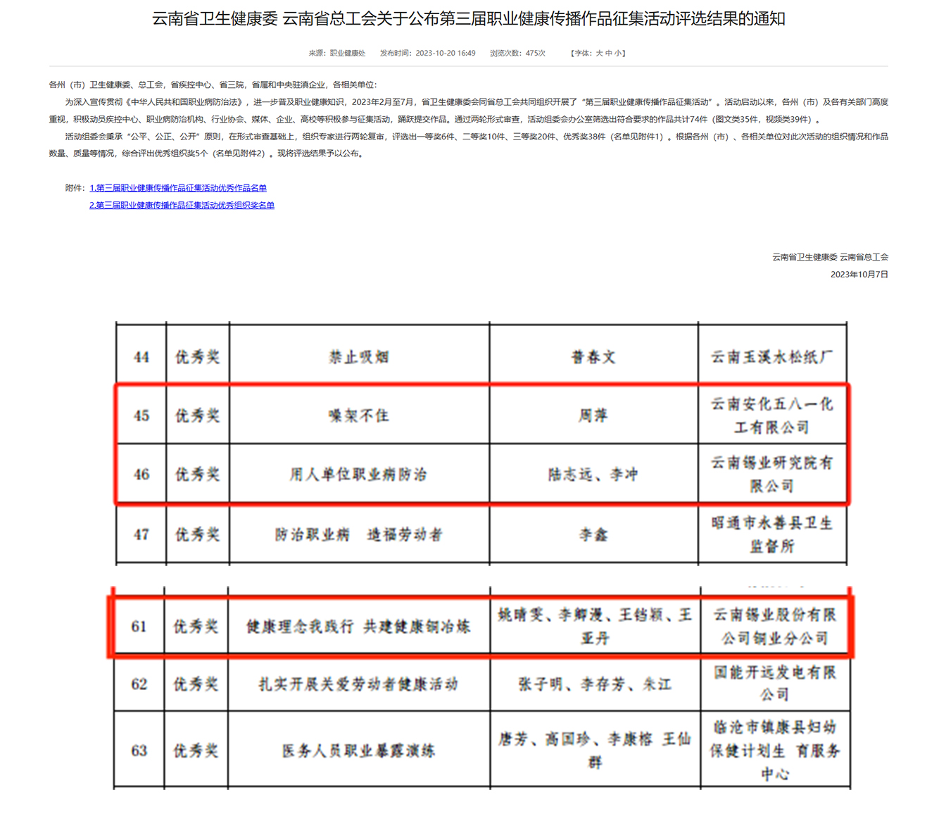 近日,由國家衛生健康委和中華全國總工會統一部署,省衛生健康委和省總工會聯合舉辦第三屆職業健康傳播作品征集活動評選結果揭曉,研究院公司選送的《用人單位職業病防治》;安化五八一公司選送的《噪架不住》;銅業分公司選送的《健康理念我踐行共建健康銅冶煉》3件作品均榮獲優秀獎。