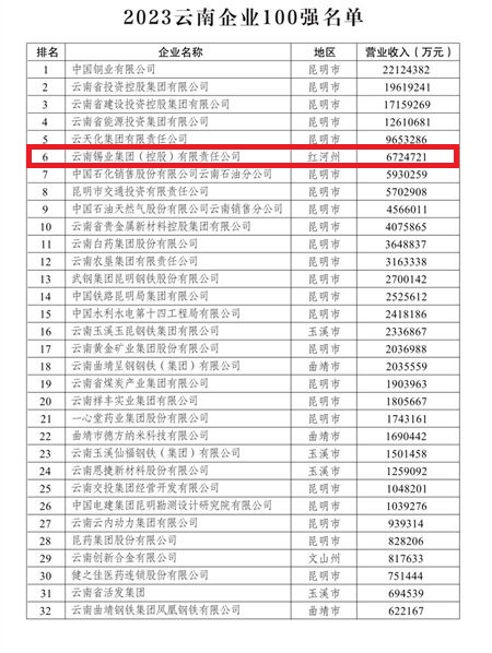 據悉:今年是省企業聯合會、省企業家協會第16年發布“云南企業100強名單”,云南省企業聯合會參照國際上通用的做法,按照企業自愿參加、自愿申報的原則,以2022年企業營業收入為入圍標準,推出2023云南企業100強、云南制造業企業100強、云南服務業企業50強、云南民營企業100強和云南高新技術企業100強、云南企業年度營業收入突破億元企業。
