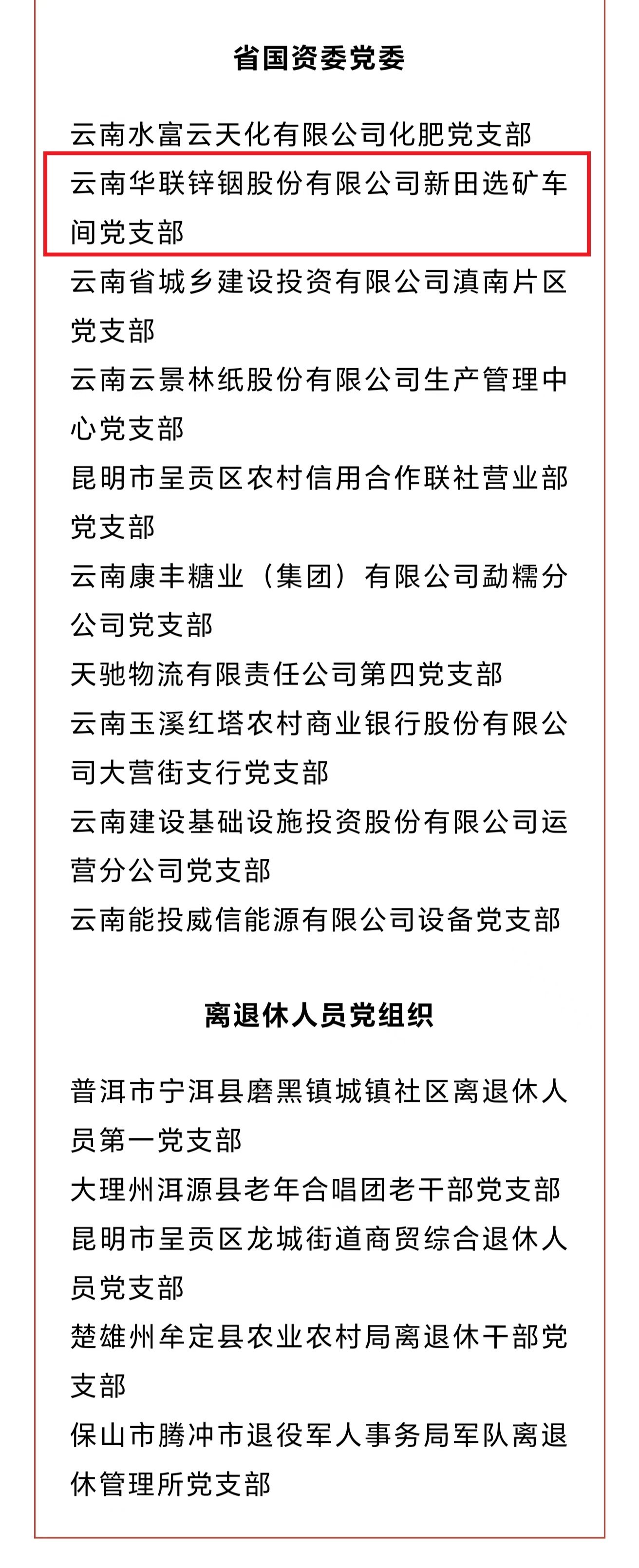 近日,中共云南省委組織部發布了《關于命名2023年度“云嶺先鋒紅旗黨支部”的決定》,華聯鋅銦公司新田選礦車間黨支部榜上有名。