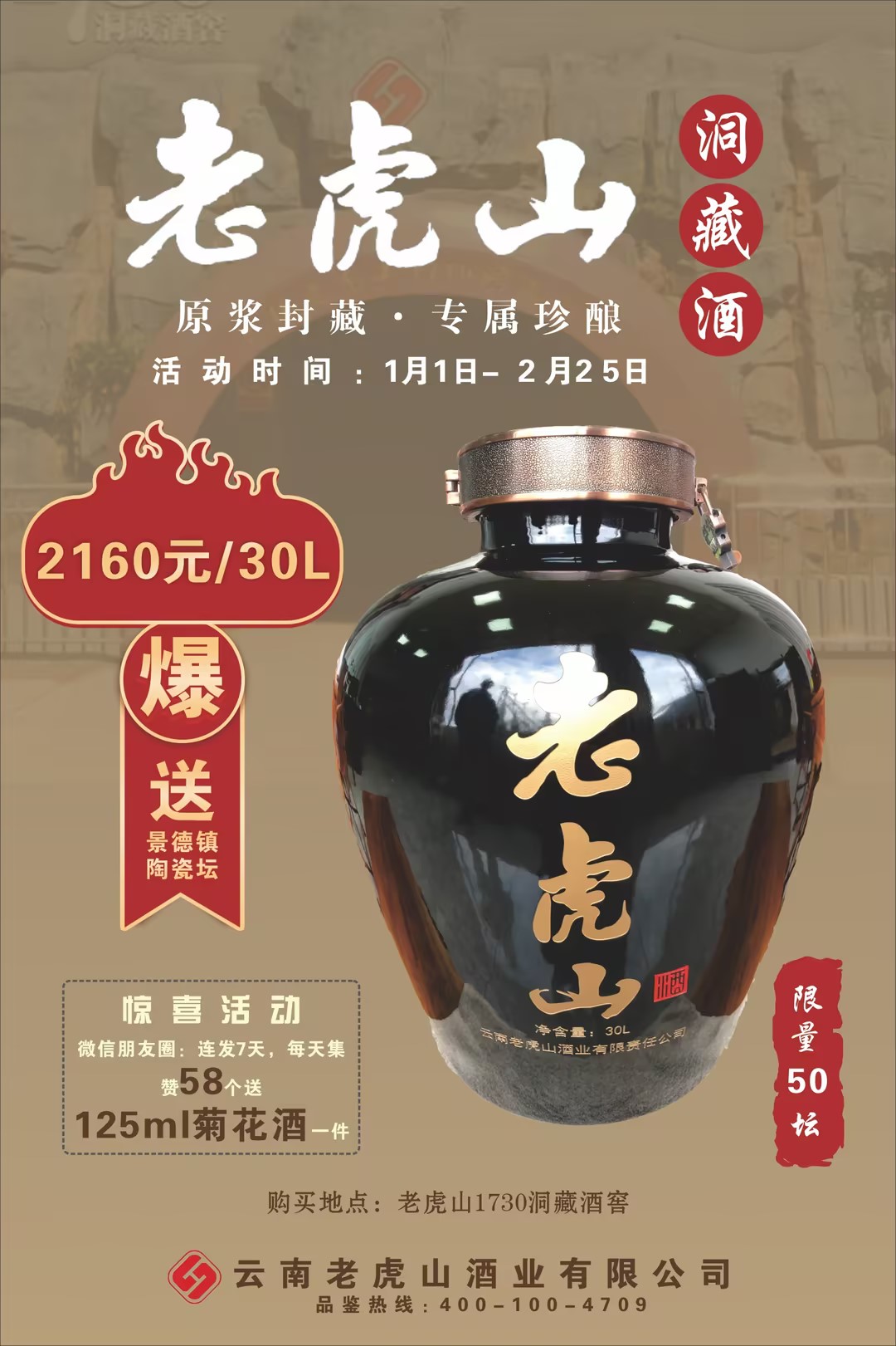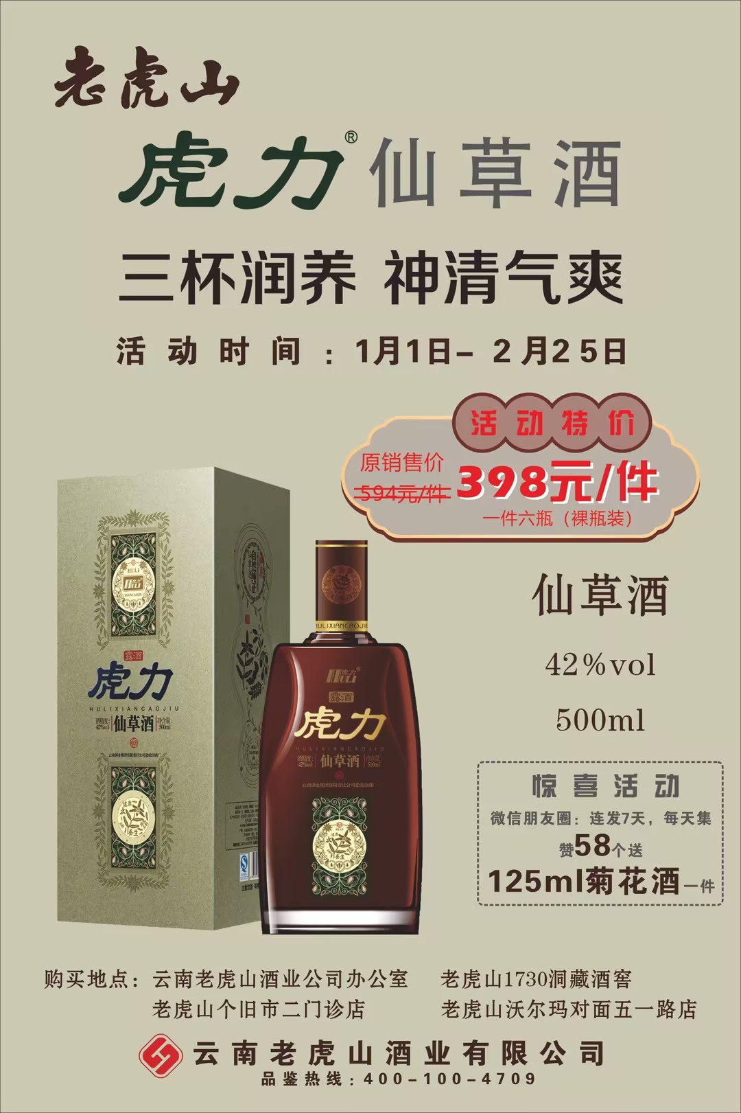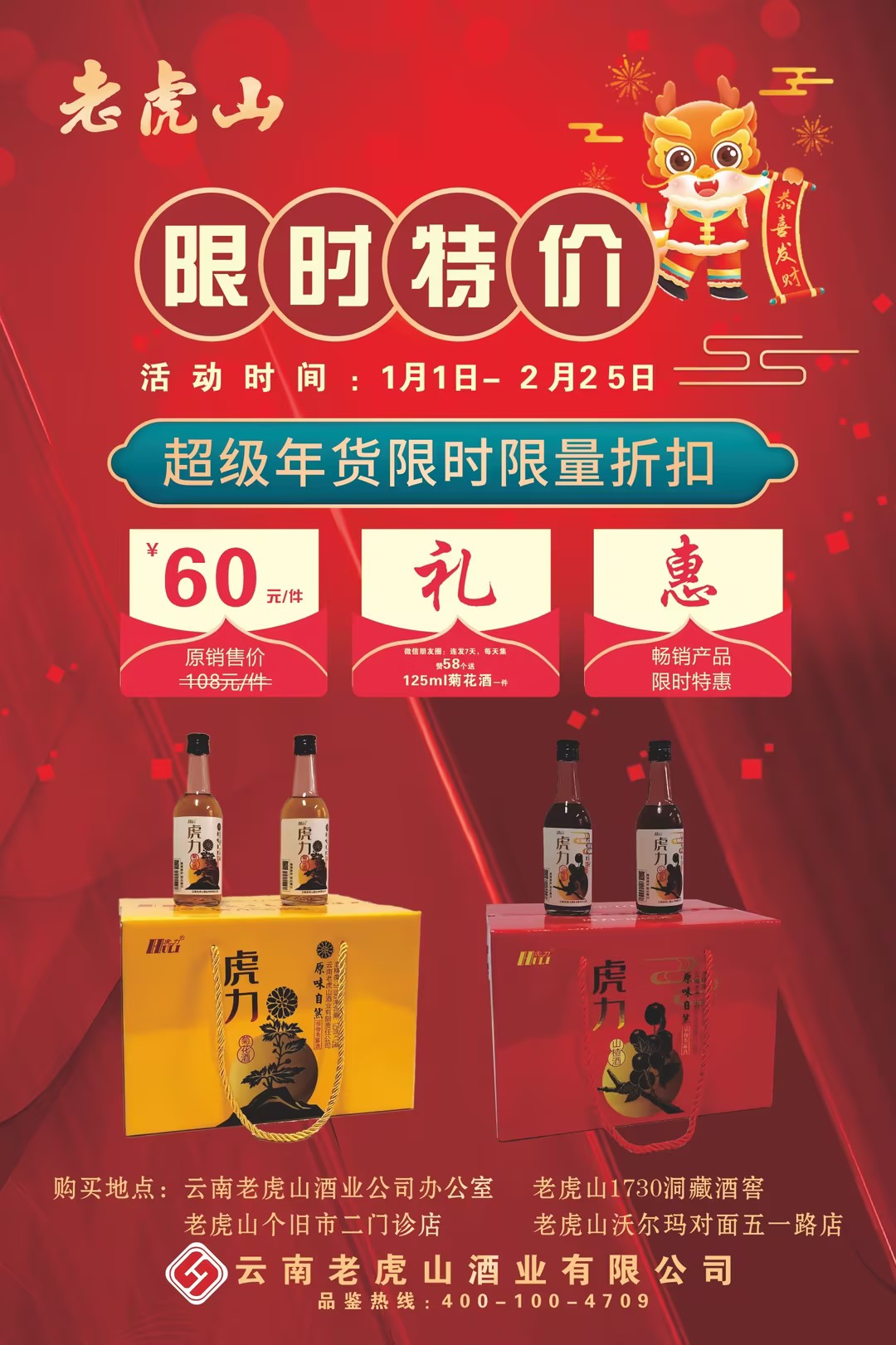 值此新春佳節即將到來之際,老虎山酒業為回饋新老顧客,特推出老虎山系列酒品優惠活動!口感醇厚,回味悠長,買即享折扣,更有好禮相送!