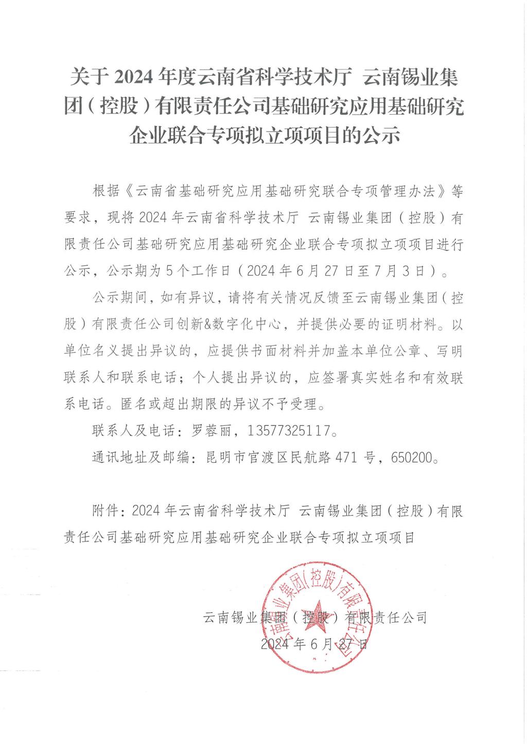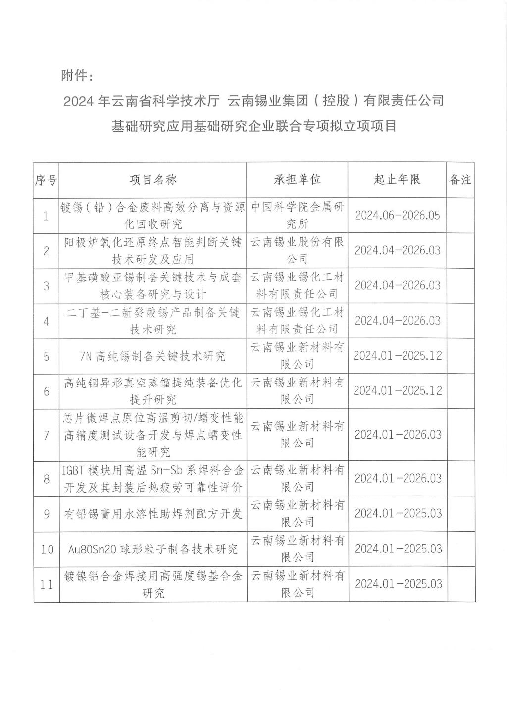 關(guān)于2024年度云南省科學(xué)技術(shù)廳 云南錫業(yè)集團(控股)有限責(zé)任公司基礎(chǔ)研究應(yīng)用基礎(chǔ)研究企業(yè)聯(lián)合專項擬立項項目的公示