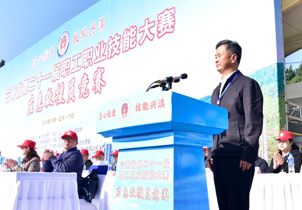 紅河州常務副州長李國民致辭,表示紅河州將努力推動形成與經濟社會發展水平相符合、與人民群眾安全需求相匹配的應急救援能力,為全省經濟社會高質量發展提供堅實的安全保障。