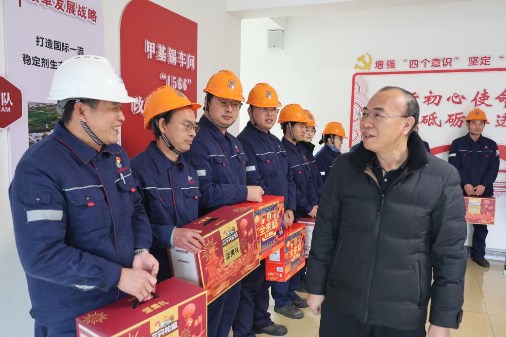在錫化工有機(jī)錫生產(chǎn)基地,孫勇與干部職工親切交流,對(duì)他們的辛勤付出和所作貢獻(xiàn)表示感謝,向職工及家屬致以節(jié)日問(wèn)候和新春祝福。孫勇強(qiáng)調(diào),春節(jié)期間工作責(zé)任尤為重大,壓力也相應(yīng)增加,要再接再厲,全力以赴做好各項(xiàng)工作,加強(qiáng)安全隱患排查與應(yīng)急準(zhǔn)備,確保春節(jié)期間安全生產(chǎn)平穩(wěn)有序。(吳云龍)