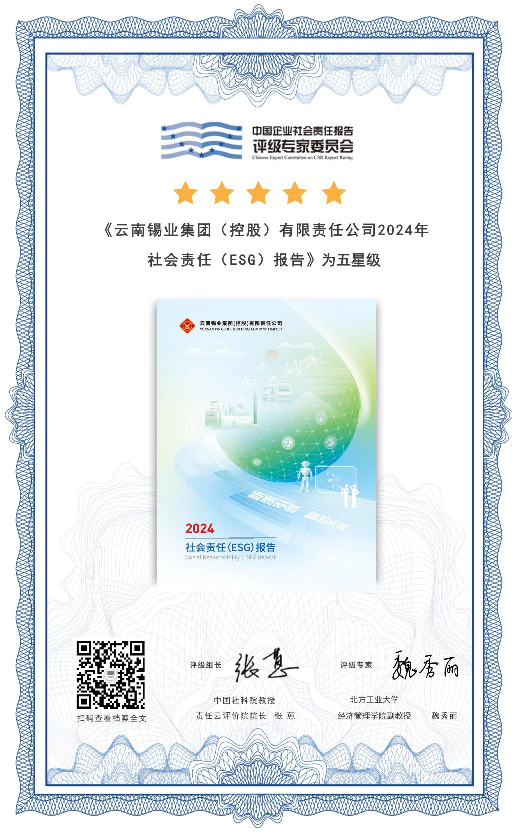 近日,經(jīng)中國企業(yè)社會(huì)責(zé)任報(bào)告評級專家委員會(huì)評定,《云南錫業(yè)集團(tuán)(控股)有限責(zé)任公司2024年社會(huì)責(zé)任(ESG)報(bào)告》獲評“五星級”,被評價(jià)為“是一份卓越的企業(yè)可持續(xù)發(fā)展報(bào)告”。這是云錫連續(xù)兩年斬獲“五星級”權(quán)威評級,體現(xiàn)了業(yè)界對云錫長期堅(jiān)持可持續(xù)發(fā)展、積極傳遞責(zé)任價(jià)值的充分認(rèn)可與肯定,進(jìn)一步提升了公司在ESG領(lǐng)域的品牌形象。