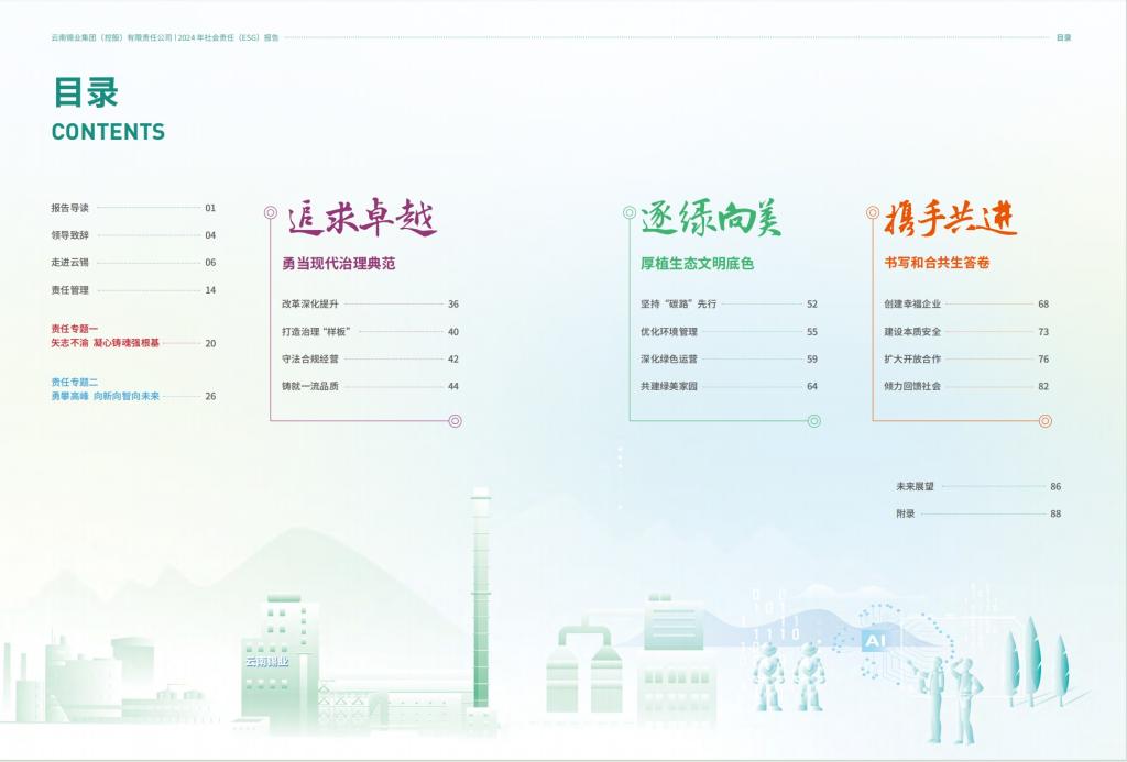 《報(bào)告》呈現(xiàn)“追求卓越 勇當(dāng)現(xiàn)代治理典范”“逐綠向美 厚植生態(tài)文明底色”“攜手共進(jìn) 書寫和合共生答卷”三個(gè)責(zé)任篇章,系統(tǒng)闡述公司對監(jiān)管機(jī)構(gòu)、股東和投資者、客戶與行業(yè)合作伙伴、員工及社區(qū)等多方訴求的回應(yīng),充分展示云錫在深入踐行ESG理念方面的新舉措、新成果、新貢獻(xiàn)。在具體內(nèi)容上,精選“30+”個(gè)鮮活而深刻的履責(zé)案例,串聯(lián)起云錫在改革提升、戰(zhàn)略布局、現(xiàn)代治理、質(zhì)量管理、綠色發(fā)展、員工關(guān)懷、海外履責(zé)、社會(huì)公益等核心領(lǐng)域的責(zé)任足跡,以多元化全景式繪制ESG履責(zé)實(shí)踐行業(yè)“樣板圖”。