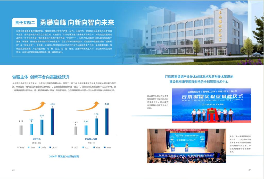 《報(bào)告》緊扣“新質(zhì)引領(lǐng) 智創(chuàng)未來”主題,圍繞國家重大戰(zhàn)略、行業(yè)發(fā)展所趨、社會(huì)熱點(diǎn)關(guān)切,全方位展示云錫在全面貫徹新發(fā)展理念、加快發(fā)展新質(zhì)生產(chǎn)力、推動(dòng)可持續(xù)發(fā)展方面的重要成效,充分彰顯“國之大者”的責(zé)任擔(dān)當(dāng)。