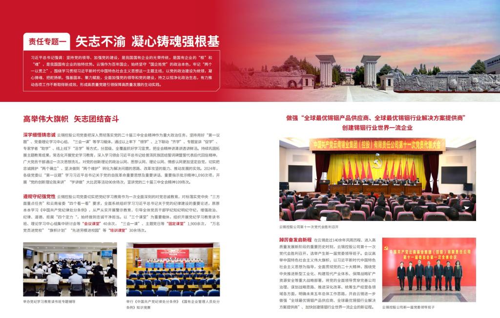 《報(bào)告》設(shè)置“矢志不渝 凝心鑄魂強(qiáng)根基”“勇攀高峰 向新向智向未來”兩大責(zé)任專題,貫穿深入學(xué)習(xí)貫徹習(xí)近平新時(shí)代中國特色社會(huì)主義思想和黨的二十大精神主線,聚焦“做強(qiáng)兩個(gè)全球最優(yōu)、創(chuàng)建錫銦行業(yè)世界一流”和“打造具有核心競爭力的創(chuàng)新高地”兩條軸線,生動(dòng)展現(xiàn)云錫在全面加強(qiáng)黨的領(lǐng)導(dǎo)、以高質(zhì)量黨建引領(lǐng)高質(zhì)量發(fā)展、推動(dòng)科技自立自強(qiáng)等方面取得的突出成效。