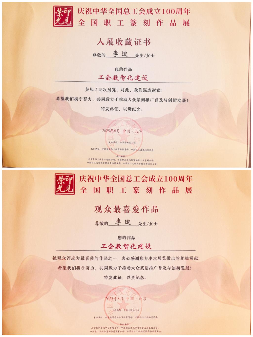 錫筆生輝頌百年工運。近日,由控股公司工會選送的錫都實業(yè)公司李迪篆刻作品《工會數(shù)智化建設》成功入選“印見榮光”中華全國總工會成立100周年全國職工篆刻作品展,并獲評觀眾最喜愛作品之一,成為全國工會系統(tǒng)數(shù)智化建設成果的藝術(shù)縮影。