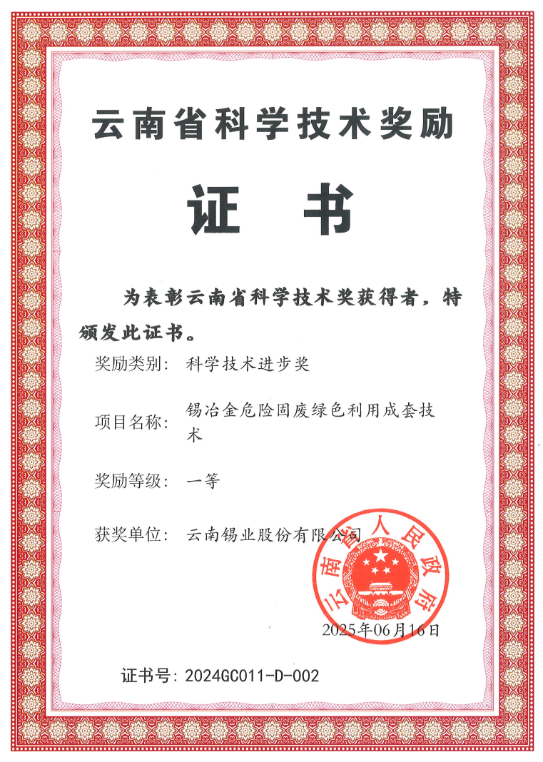 近日,2024年度云南省科學(xué)技術(shù)獎(jiǎng)勵(lì)大會(huì)在昆明舉行。由昆明理工大學(xué)牽頭、錫業(yè)股份參與的“錫冶金危險(xiǎn)固廢綠色利用成套技術(shù)”榮獲云南省科技進(jìn)步獎(jiǎng)一等獎(jiǎng)。