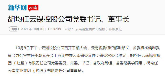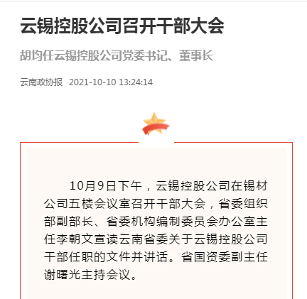 李朝文宣讀中共云南省委文件:省委常委會決定,胡均任云南錫業集團(控股)有限責任公司黨委委員、常委、書記;省政府黨組、省委常委會同意,胡均任云南錫業集團(控股)有限責任公司董事長。