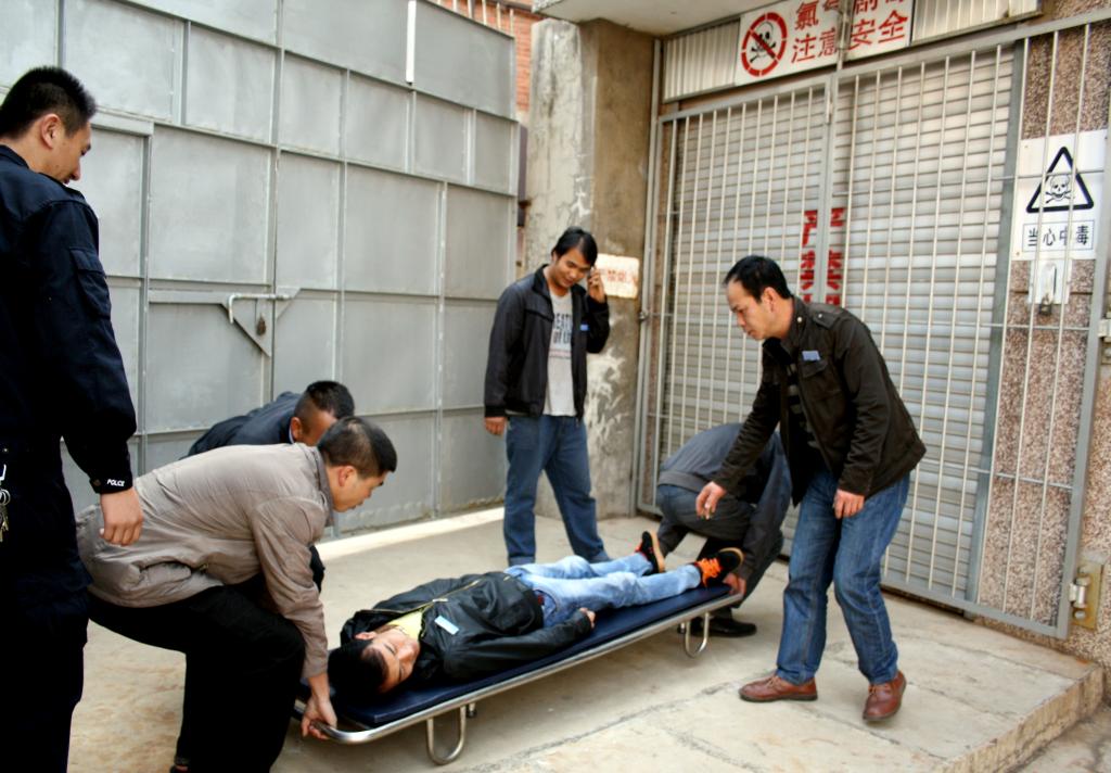 上午9:45分,供水公司應急處理辦公室接到高處墜落事故報告,一名制水工在廠區凈化站從高處墜落地面。指揮員立即啟動應急救援措施,9:50分,人防專業隊攜帶擔架、急救藥箱等器材進入演練現場,經查看,墜落人員無明顯外傷,頭腦較清醒,右耳有出血現象,疑似顱腦損傷。救援人員把傷員抬上擔架抬到安全位置,抬時讓傷員安靜、保暖、平臥、少動、面部轉向右側,最后由模擬120急救車載傷者駛出演練現場,并到醫院救治。演練結束后,演練人員立即進行總結,深入學習了《云錫供水公司突發性不穩定因素及恐怖突襲事件應急預案》。