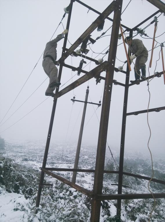 由于不知跳閘原因,電工師傅們在確認站內設備完好的情況下,只有沿線對每一棵電桿進行仔細檢查,雪太大,路面和山坡積雪較深,電工師傅們深一腳、淺一腳地艱難行走在崎嶇的山路上,雖然雪花肆虐,手腳凍得麻木,但電工師傅們仍然堅持不停排查,在經過兩個多小時的艱難排查后,終于查出,故障是因樹木被大雪壓斷打在高壓線路上造成線路中斷出現短路引起停電。問題查出后,師傅們迅速在風雪中對線路進行搶修,由于風雪較大,電桿上已附上了一層厚厚冰雪,用腳扣和踩板上去十分困難,一不留神,就容易打滑跌落發生危險,但為了保證正常供電,師傅們仍然小心翼翼地爬上“冰桿”,有條不紊地把“受傷”的高壓線連接起來,雪花不停地飄落到師傅們的身上,衣服漸漸被滲透,身體被凍得生痛,但參加搶修的電工師傅們仍然忘我地投入在搶修工作中。經過近8個小的搶修,終于于下午18:00搶修好受損線路,恢復正常供電。