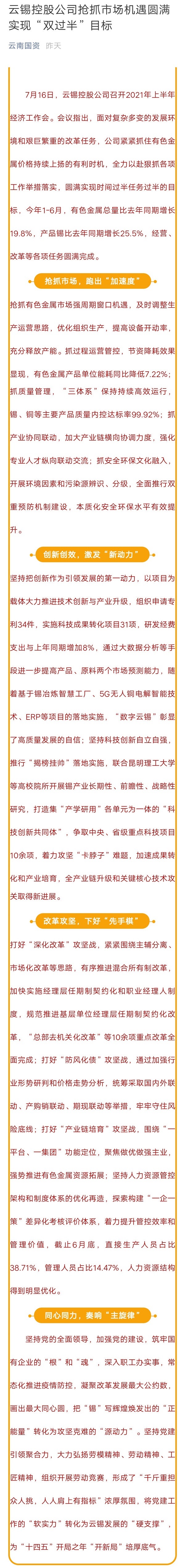 【媒體關(guān)注】云南國資:云錫控股公司搶抓市場機遇圓滿實現(xiàn)“雙過半”目標
