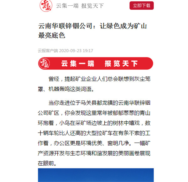 當(dāng)你走進(jìn)位于馬關(guān)縣都龍鎮(zhèn)的云南華聯(lián)鋅銦公司礦區(qū),你會(huì)發(fā)現(xiàn)這里常年被郁郁蔥蔥的青山環(huán)抱著,小鳥在采礦場(chǎng)邊坡上的樹林中嬉戲,數(shù)十輛車輪比人還高的大型拉礦車在有條不紊的工作著,辦公區(qū)更是環(huán)境優(yōu)美、窗明幾凈。一幅礦產(chǎn)資源開發(fā)與生態(tài)環(huán)境和諧發(fā)展的美麗畫卷展現(xiàn)在眼前。