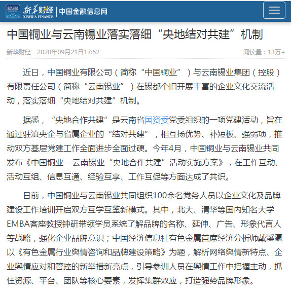 據(jù)悉,“央地合作共建”是云南省國(guó)資委黨委組織的一項(xiàng)黨建活動(dòng),旨在通過(guò)駐滇央企與省屬企業(yè)的“結(jié)對(duì)共建”,相互揚(yáng)優(yōu)勢(shì)、補(bǔ)短板、強(qiáng)弱項(xiàng),推動(dòng)雙方基層黨建工作全面進(jìn)步全面過(guò)硬。今年4月,中國(guó)銅業(yè)與云南錫業(yè)共同發(fā)布《中國(guó)銅業(yè)—云南錫業(yè)“央地合作共建”活動(dòng)實(shí)施方案》,在工作互動(dòng)、活動(dòng)互組、信息互通、經(jīng)驗(yàn)互享、工作互促等方面達(dá)成了共識(shí)。