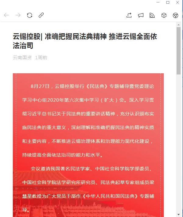 8月27日,云錫控股舉行《民法典》專題輔導(dǎo)暨黨委理論學(xué)習(xí)中心組2020年第六次集中學(xué)習(xí)(擴(kuò)大)會。深入學(xué)習(xí)貫徹習(xí)近平總書記關(guān)于民法典的重要講話精神,充分認(rèn)識頒布實(shí)施民法典的重大意義,深刻理解和準(zhǔn)確把握民法典的精神實(shí)質(zhì)和主要內(nèi)容,不斷推進(jìn)云錫治理體系和治理能力現(xiàn)代化建設(shè),持續(xù)提高全面依法治司的能力和水平。