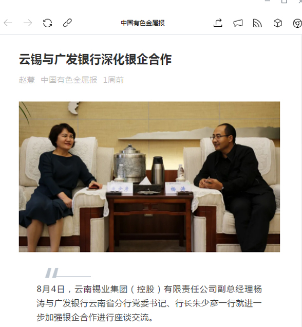 8月4日,云南錫業(yè)集團(tuán)(控股)有限責(zé)任公司副總經(jīng)理?xiàng)顫c廣發(fā)銀行云南省分行黨委書(shū)記、行長(zhǎng)朱少?gòu)┮恍芯瓦M(jìn)一步加強(qiáng)銀企合作進(jìn)行座談交流。