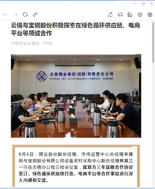 8月6日,錫業(yè)股份副總經(jīng)理、市場運營中心總經(jīng)理吳建勛與寶鋼股份有限公司設備資材采購中心副總經(jīng)理黃夏蘭一行在云錫辦公樓三樓會議室,就雙方三年戰(zhàn)略合作協(xié)議簽訂、綠色循環(huán)供應鏈打造、電商平臺等合作事宜進行深入溝通和交流。