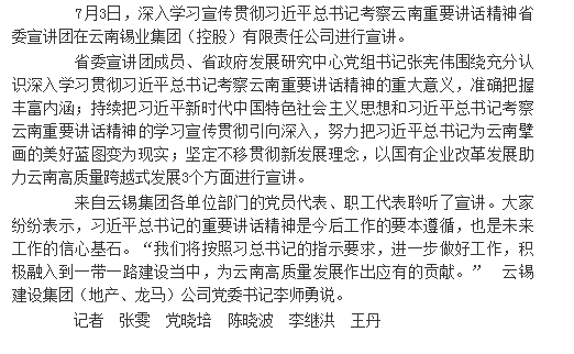 7月3日,深入學習宣傳貫徹習近平總書記考察云南重要講話精神省委宣講團在云南錫業集團(控股)有限責任公司進行宣講。