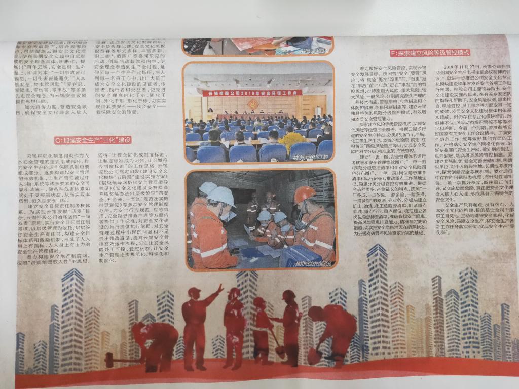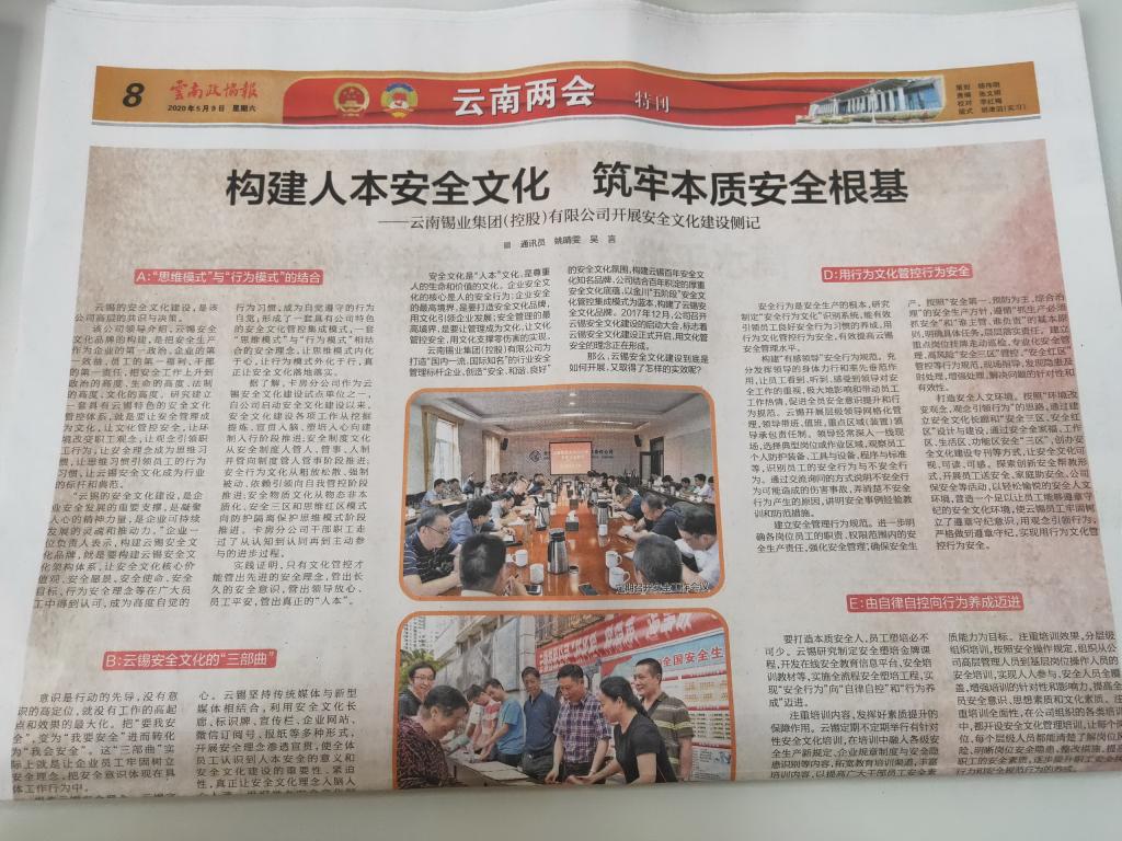 云南錫業(yè)集團(tuán)(控股)有限責(zé)任公司為打造“國內(nèi)一流,國際知名”的行業(yè)安全管理標(biāo)桿企業(yè)創(chuàng)造安全、和諧、良好”的安全文化氛圍,構(gòu)建云錫百年安全文化知名品牌,公司結(jié)合百年積淀的厚重安全文化底瘟,以金川“五階段”安全文化管控集成模式為藍(lán)本,構(gòu)建了云錫安全文化品牌。2017年12月,公司召開云錫安全文化建設(shè)的啟動(dòng)大會(huì),標(biāo)志著云錫安全文化建沒正式開啟,用文化管安全的理念正在形成。