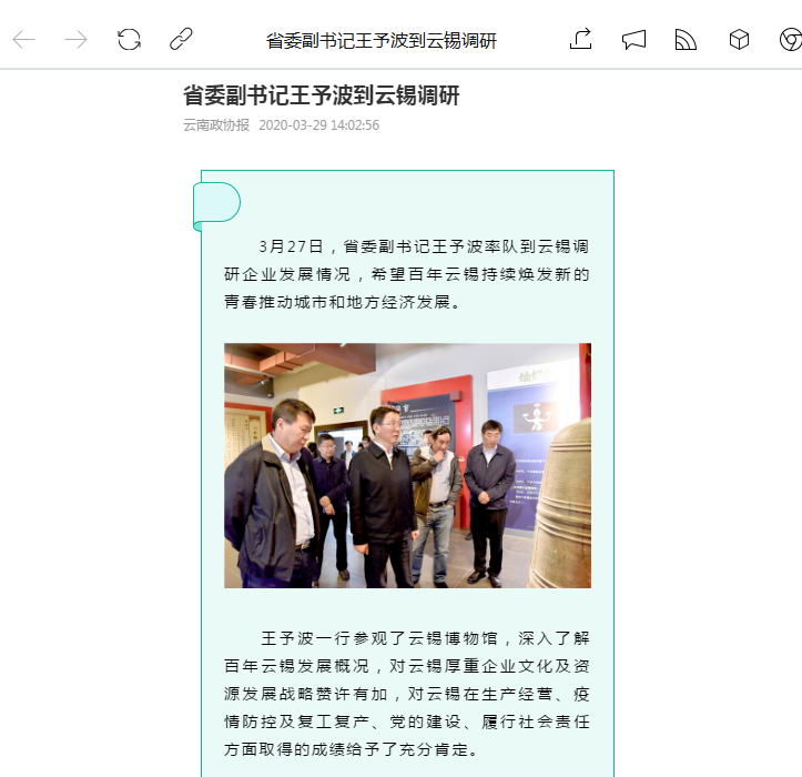 王予波一行參觀了云錫博物館,深入了解百年云錫發(fā)展概況,對云錫厚重企業(yè)文化及資源發(fā)展戰(zhàn)略贊許有加,對云錫在生產(chǎn)經(jīng)營、疫情防控及復工復產(chǎn)、黨的建設(shè)、履行社會責任方面取得的成績給予了充分肯定。