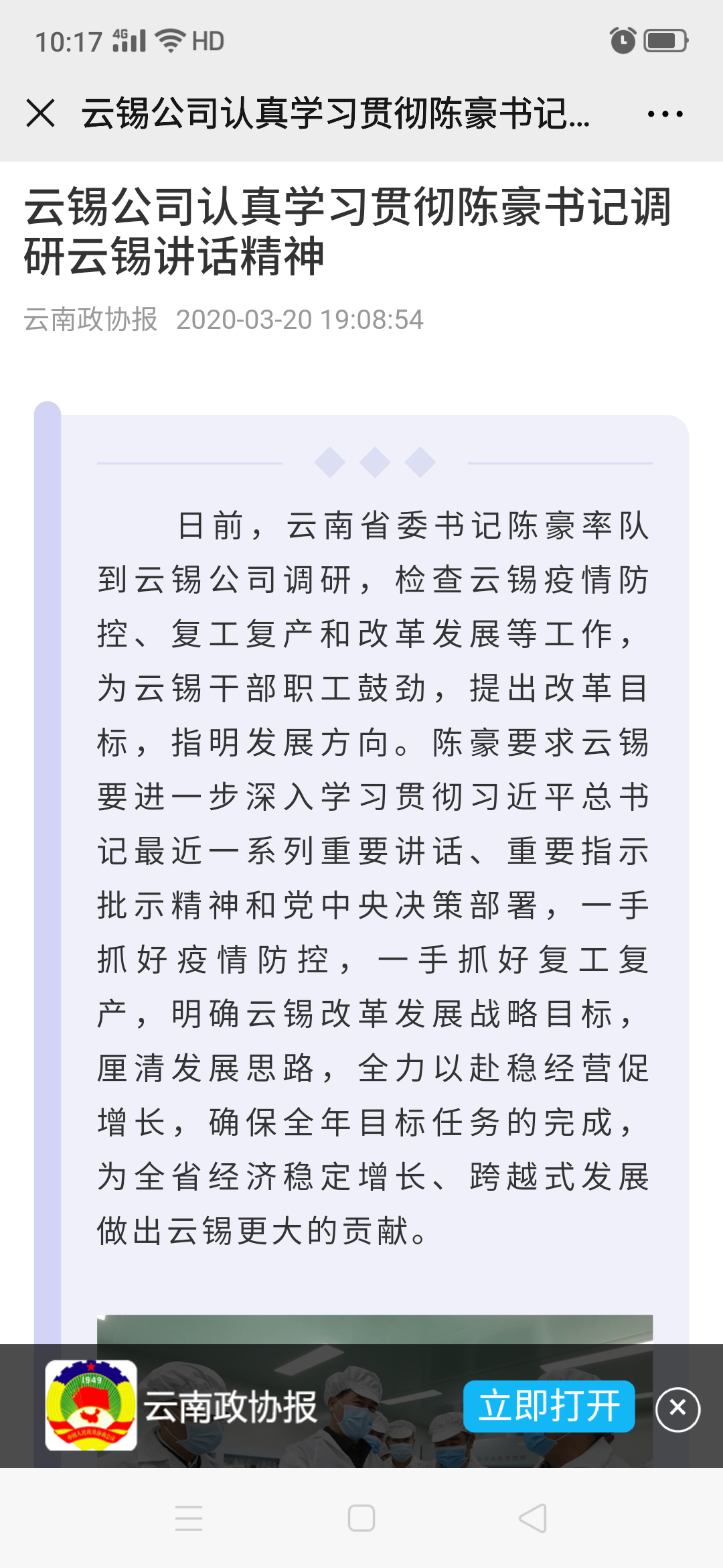 為把陳豪書記調(diào)研云錫講話精神落到實(shí)處,云錫公司迅速召開黨委常委會(huì)會(huì)議,認(rèn)真?zhèn)鬟_(dá)學(xué)習(xí)陳豪在調(diào)研云錫疫情防控、復(fù)工復(fù)產(chǎn)和改革發(fā)展工作會(huì)上的講話精神,深入研究貫徹落實(shí)意見,以精準(zhǔn)、有力、務(wù)實(shí)的舉措助推云錫高質(zhì)量轉(zhuǎn)型改革發(fā)展。