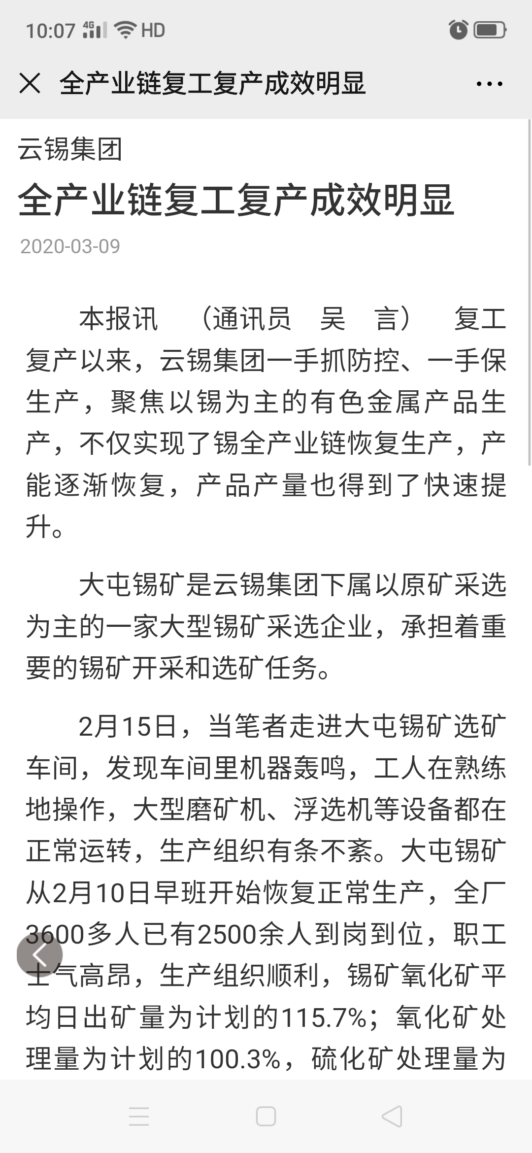 目前,云錫集團錫產品國內市場占有率為50%,國際市場占有率達20%,截至2019年云錫集團精錫產量已連續15年居世界首位。集團錫主業全產業鏈的復工復產,對于國內外錫產業鏈相關企業的穩定運行將起到較好保障作用。