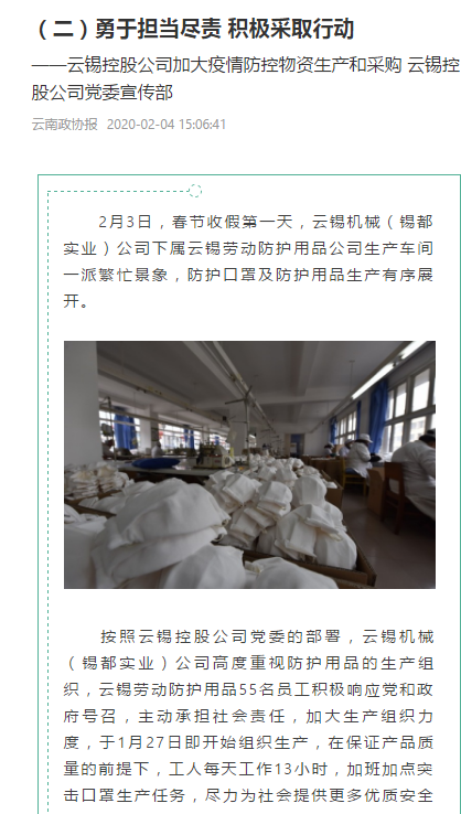 在積極組織公司內(nèi)部企業(yè)開足馬力生產(chǎn)防護(hù)用品的同時,云錫控股公司按照省委、省政府和省國資委黨委的安排部署,切實扛起國有企業(yè)參與疫情防控的政治責(zé)任,在我省醫(yī)用口罩等物資奇缺的情況下,云錫控股公司主要領(lǐng)導(dǎo)親自指揮部署,要求云錫海外公司充分發(fā)揮物資采購優(yōu)勢,在海外多地迅速啟動口罩等緊缺物資的采購工作。