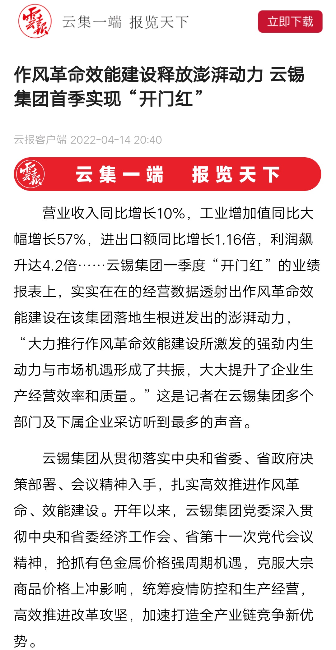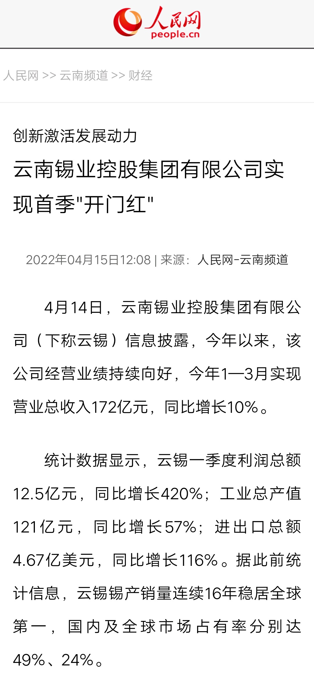 媒體關(guān)注| 人民網(wǎng)、新華財經(jīng)、云報、云南國資等媒體關(guān)注云錫實現(xiàn)首季開門紅
