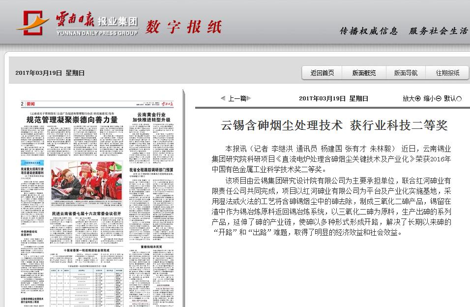 本報(bào)訊(記者 李繼洪 通訊員 楊建國 張有才 朱林毅) 近日,云南錫業(yè)集團(tuán)研究院科研項(xiàng)目《直流電爐處理含砷煙塵關(guān)鍵技術(shù)及產(chǎn)業(yè)化》榮獲2016年中國有色金屬工業(yè)科學(xué)技術(shù)獎(jiǎng)二等獎(jiǎng)。
