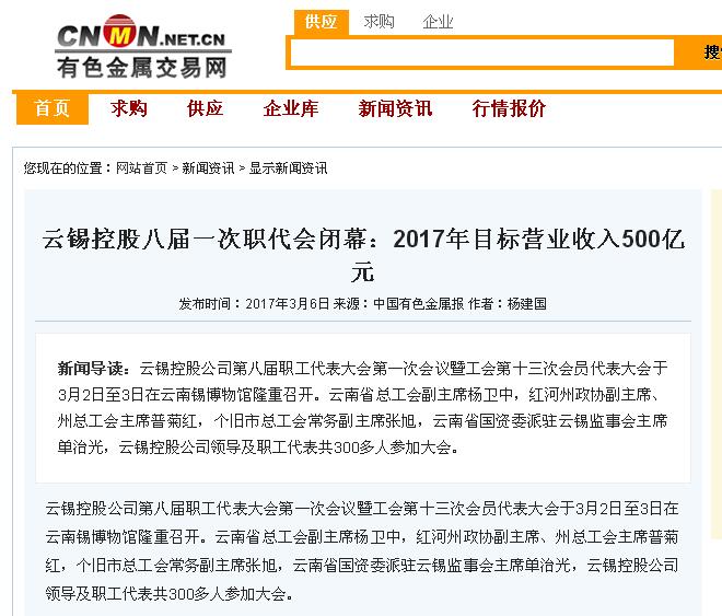 云錫控股公司總經(jīng)理李剛代表控股公司作題為《奮戰(zhàn)2017為云錫實(shí)現(xiàn)扭虧為盈而努力拼搏》的行政工作報(bào)告,2017年的主要目標(biāo)是營(yíng)業(yè)收入:500億元。奮斗目標(biāo)是實(shí)現(xiàn)扭虧為盈。在云錫控股公司實(shí)現(xiàn)扭虧為盈且各單位完成預(yù)算目標(biāo)的情況下,在崗職工人均收入增長(zhǎng)8%。2017年主要任務(wù)是強(qiáng)推改革,實(shí)現(xiàn)扭虧,加速轉(zhuǎn)型。圍繞主要目標(biāo)和任務(wù),2017年要抓好以下四個(gè)方面的工作:一、強(qiáng)勢(shì)推進(jìn)改革攻堅(jiān),務(wù)求取得新突破。二、全力以赴攻堅(jiān)決戰(zhàn),務(wù)必實(shí)現(xiàn)扭虧為盈。三、突出重點(diǎn)加速轉(zhuǎn)型升級(jí),務(wù)求取得新成效。四、持續(xù)抓好和諧企業(yè)建設(shè),為改革、扭虧、轉(zhuǎn)型營(yíng)造良好的發(fā)展環(huán)境。
