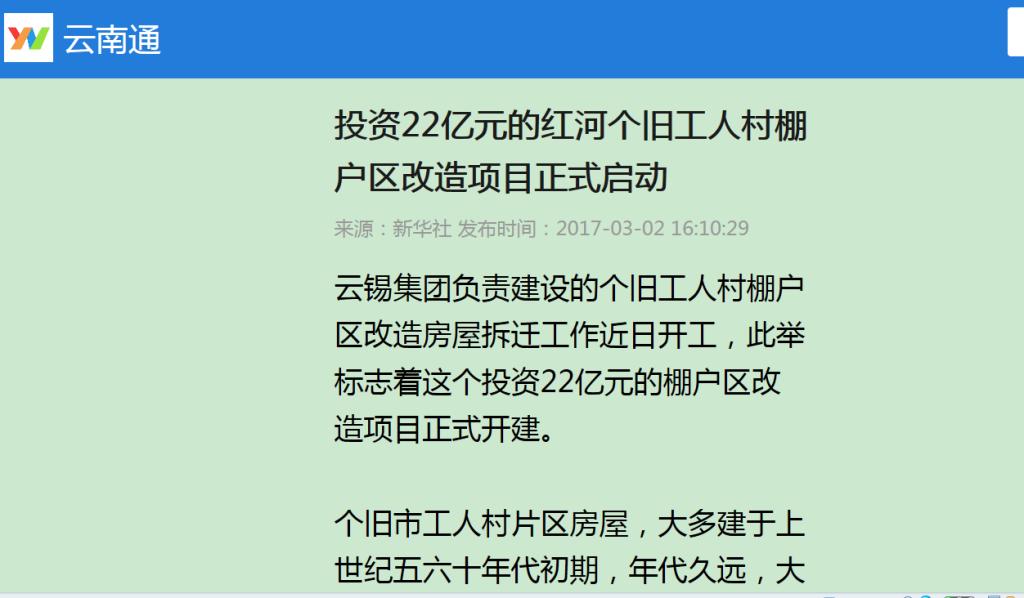 云錫集團負責建設的個舊工人村棚戶區(qū)改造房屋拆遷工作近日開工,此舉標志著這個投資22億元的棚戶區(qū)改造項目正式開建。