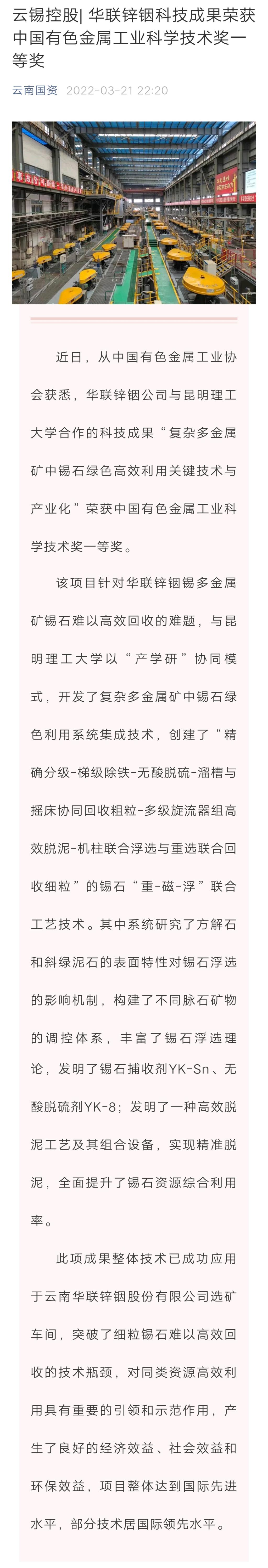 云南國資:華聯(lián)鋅銦科技成果榮獲中國有色金屬工業(yè)科學(xué)技術(shù)獎(jiǎng)一等獎(jiǎng)