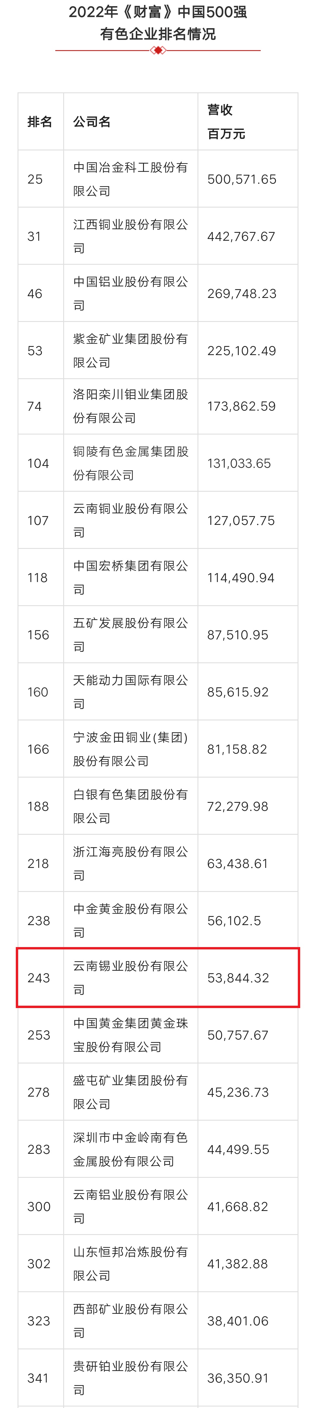 近日,2022年《財(cái)富》中國(guó)500強(qiáng)排行榜揭曉。今年500家上榜的中國(guó)上市公司總營(yíng)業(yè)收入達(dá)到62萬(wàn)億元人民幣,和上年上榜公司相比,增長(zhǎng)約17.4%;凈利潤(rùn)達(dá)到了4.7萬(wàn)億元,較上年增長(zhǎng)約9.2%。云南錫業(yè)股份有限公司以營(yíng)收538.44億元的業(yè)績(jī),排名第243位,發(fā)展實(shí)力和企業(yè)競(jìng)爭(zhēng)力再獲認(rèn)可。