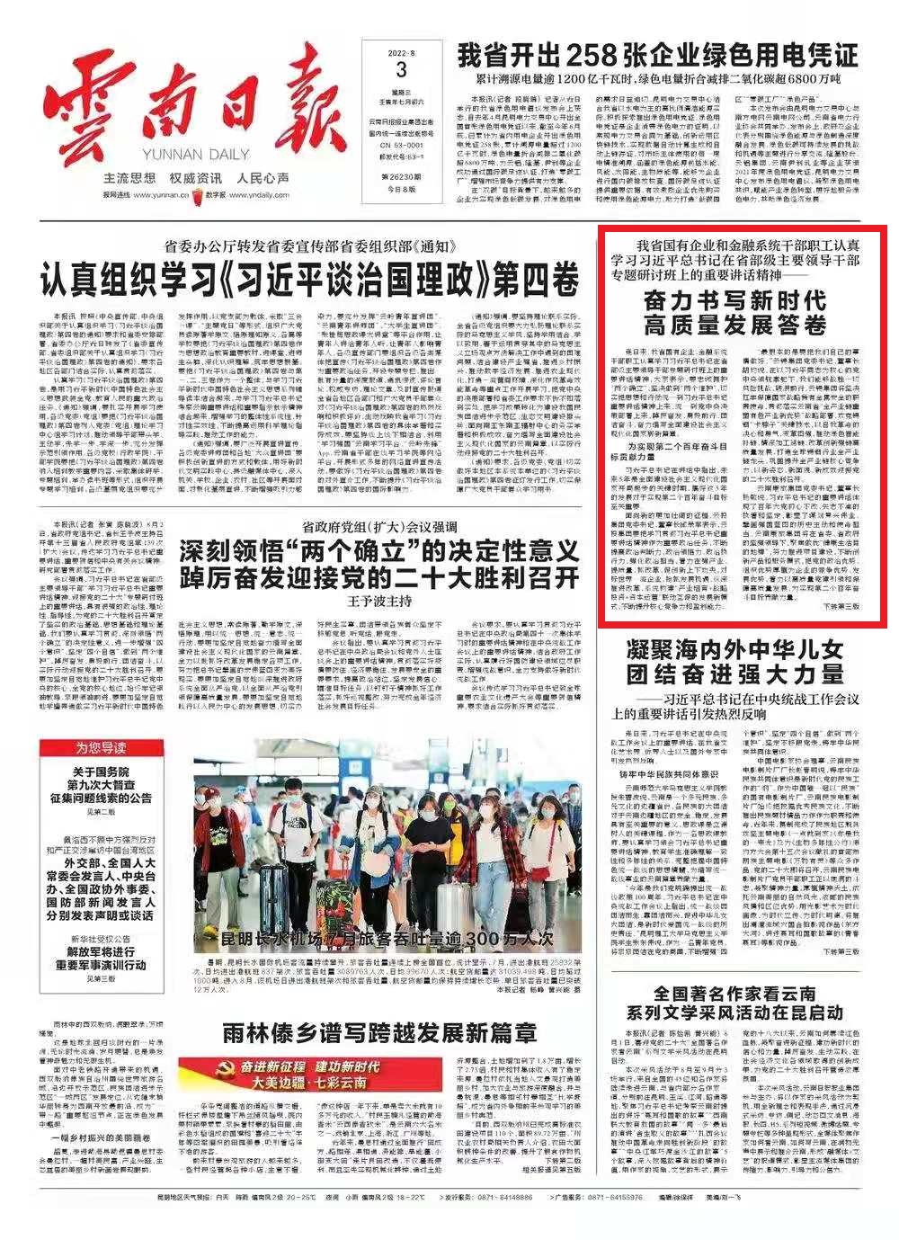 7月26日至27日,省部級主要領(lǐng)導(dǎo)干部“學(xué)習(xí)習(xí)近平總書記重要講話精神,迎接黨的二十大”專題研討班在京舉行。中共中央總書記、國家主席、中央軍委主席習(xí)近平在開班式上發(fā)表重要講話。8月3日,云南日報推出專題報道《我省國有企業(yè)和金融系統(tǒng)干部職工認(rèn)真學(xué)習(xí)習(xí)近平總書記在省部級主要領(lǐng)導(dǎo)干部專題研討班上的重要講話精神——奮力書寫新時代高質(zhì)量發(fā)展答卷》。