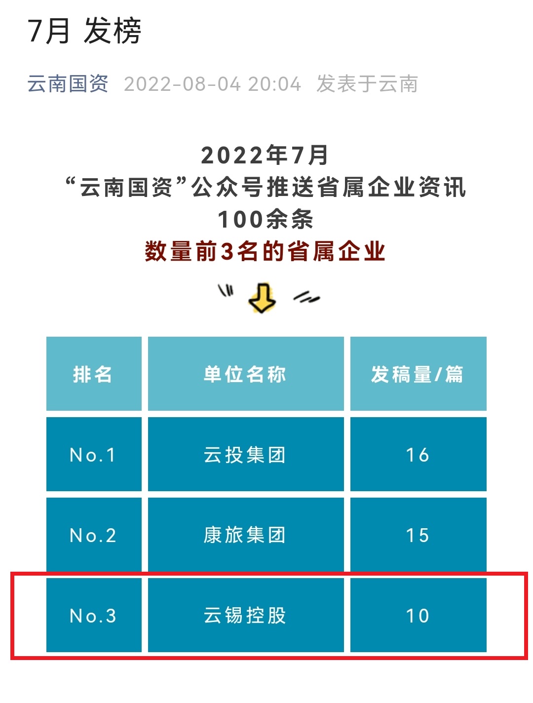 7月,控股公司創(chuàng)新宣傳工作方式方法,緊緊圍繞生產(chǎn)經(jīng)營、改革發(fā)展、黨建品牌等重點(diǎn)工作講好云錫故事,向政府、金融機(jī)構(gòu)等傳遞了云錫好聲音,好經(jīng)驗,新聞輿論傳播力、引導(dǎo)力、影響力、公信力進(jìn)一步提升,在云南國資發(fā)布的發(fā)稿量榜單中進(jìn)入前三。