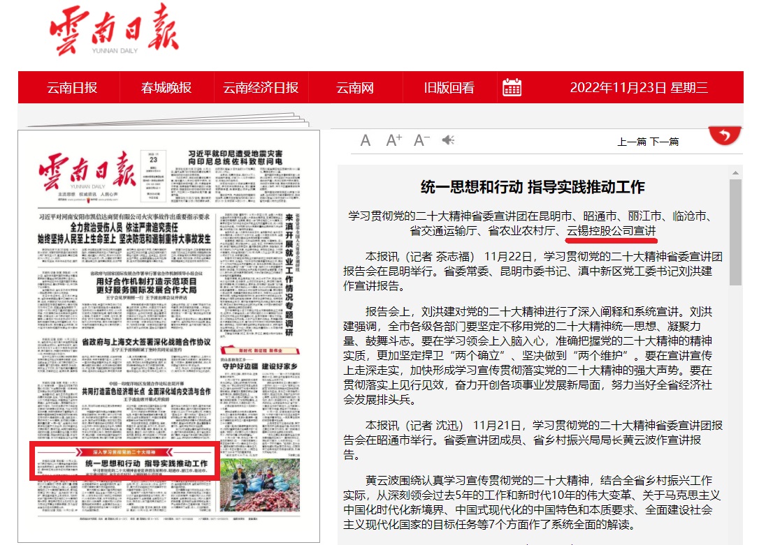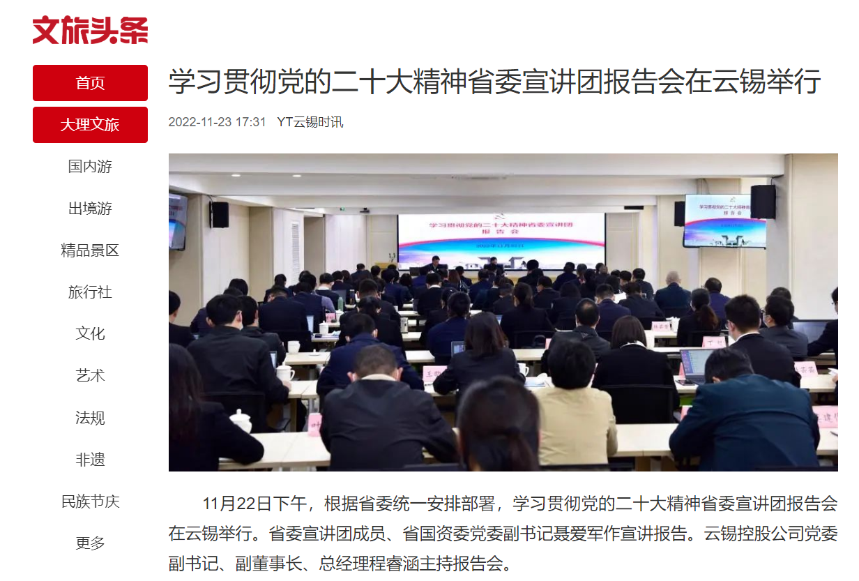 本報(bào)訊(記者 李繼洪) 11月22日,學(xué)習(xí)貫徹黨的二十大精神省委宣講團(tuán)報(bào)告會(huì)在云錫控股公司舉行。省委宣講團(tuán)成員、省國(guó)資委黨委副書記聶愛軍作宣講報(bào)告。