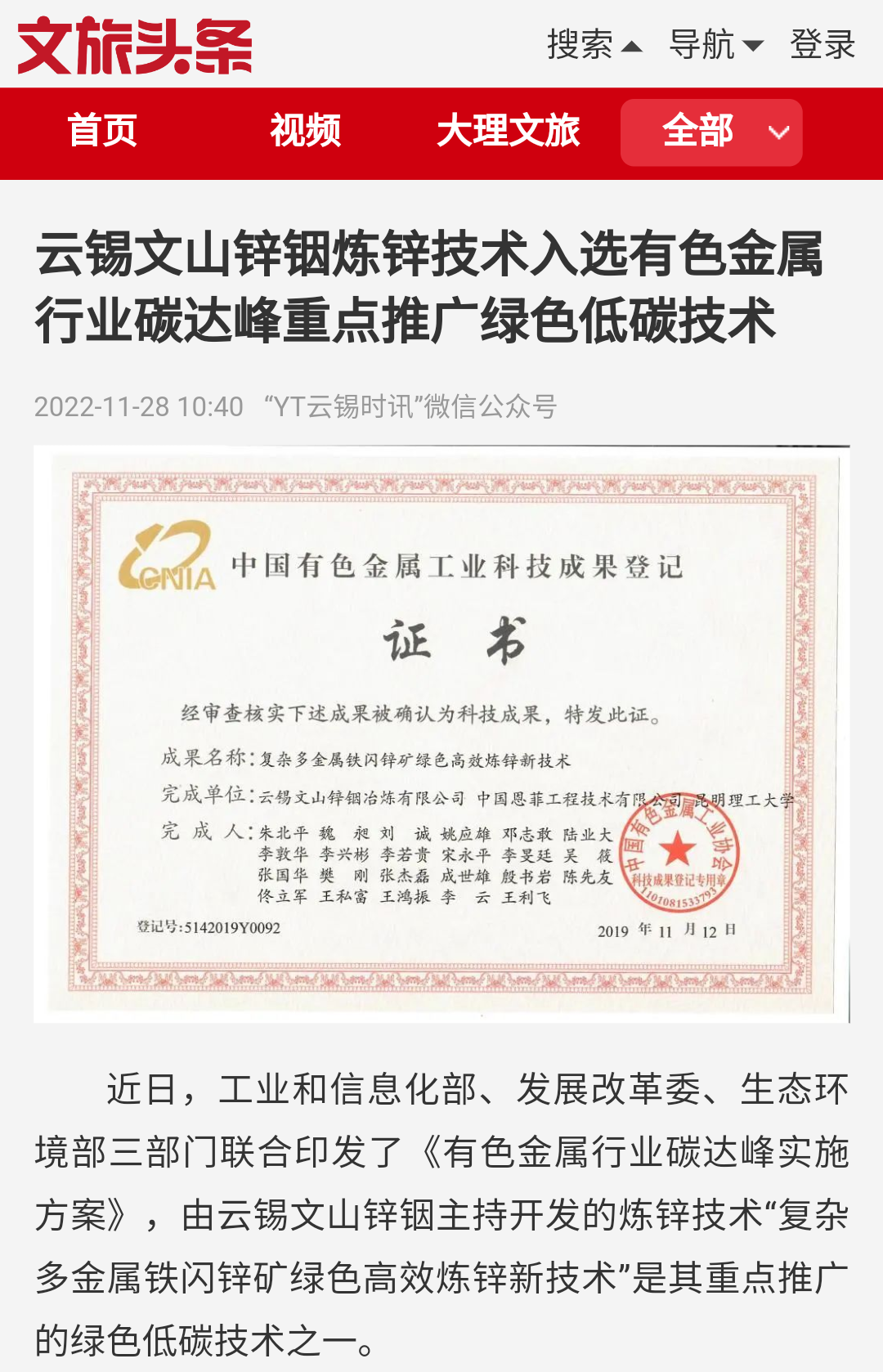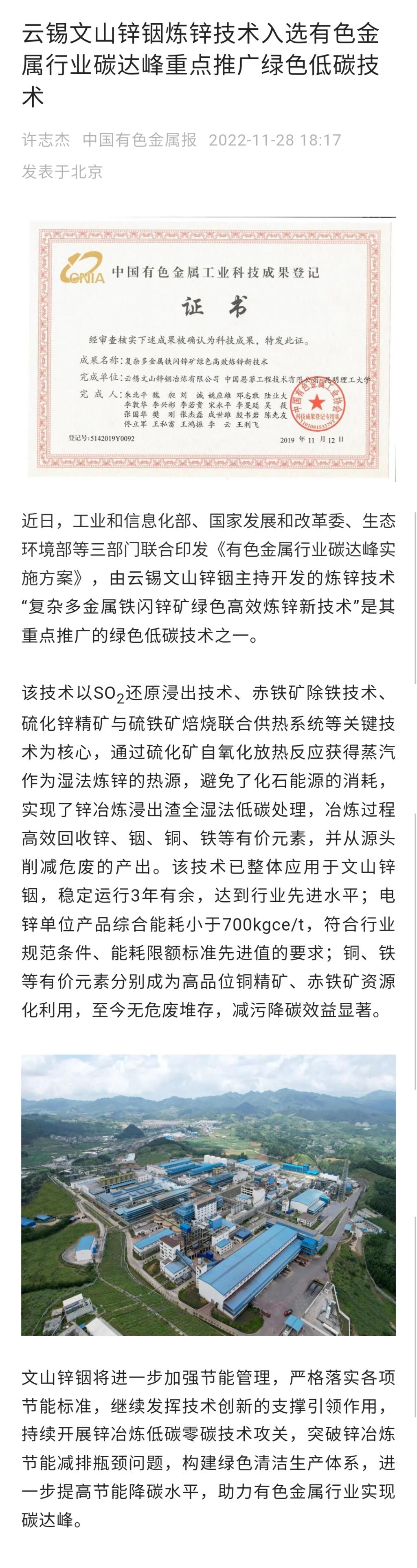 中國有色金屬報、文旅頭條:云錫文山鋅銦煉鋅技術(shù)入選有色金屬行業(yè)碳達峰重點推廣綠色低碳技術(shù)