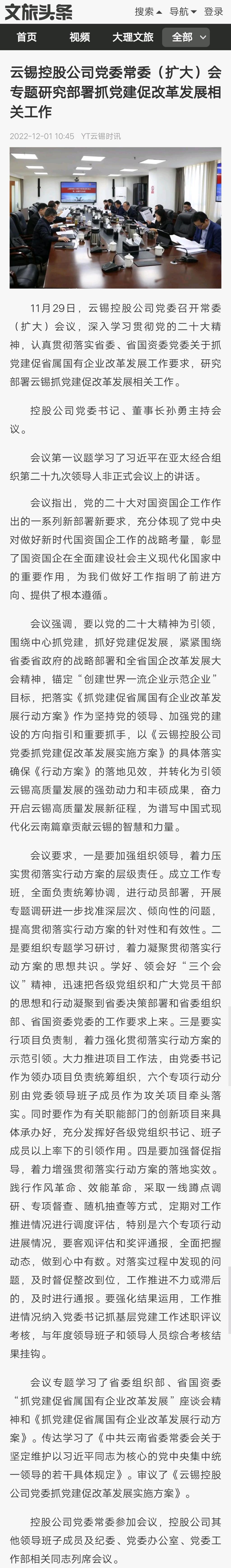 文旅頭條:云錫控股公司黨委常委(擴(kuò)大)會專題研究部署抓黨建促改革發(fā)展相關(guān)工作