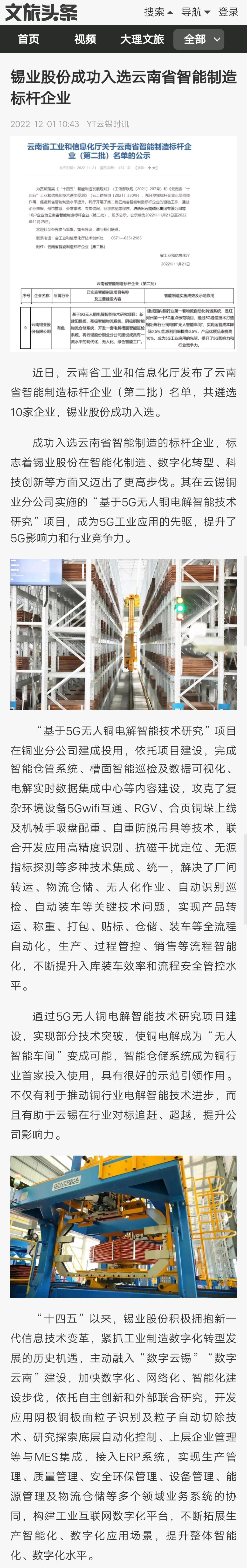 文旅頭條:錫業(yè)股份成功入選云南省智能制造標(biāo)桿企業(yè)