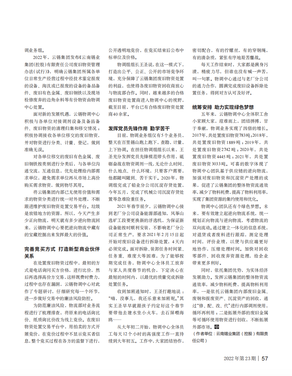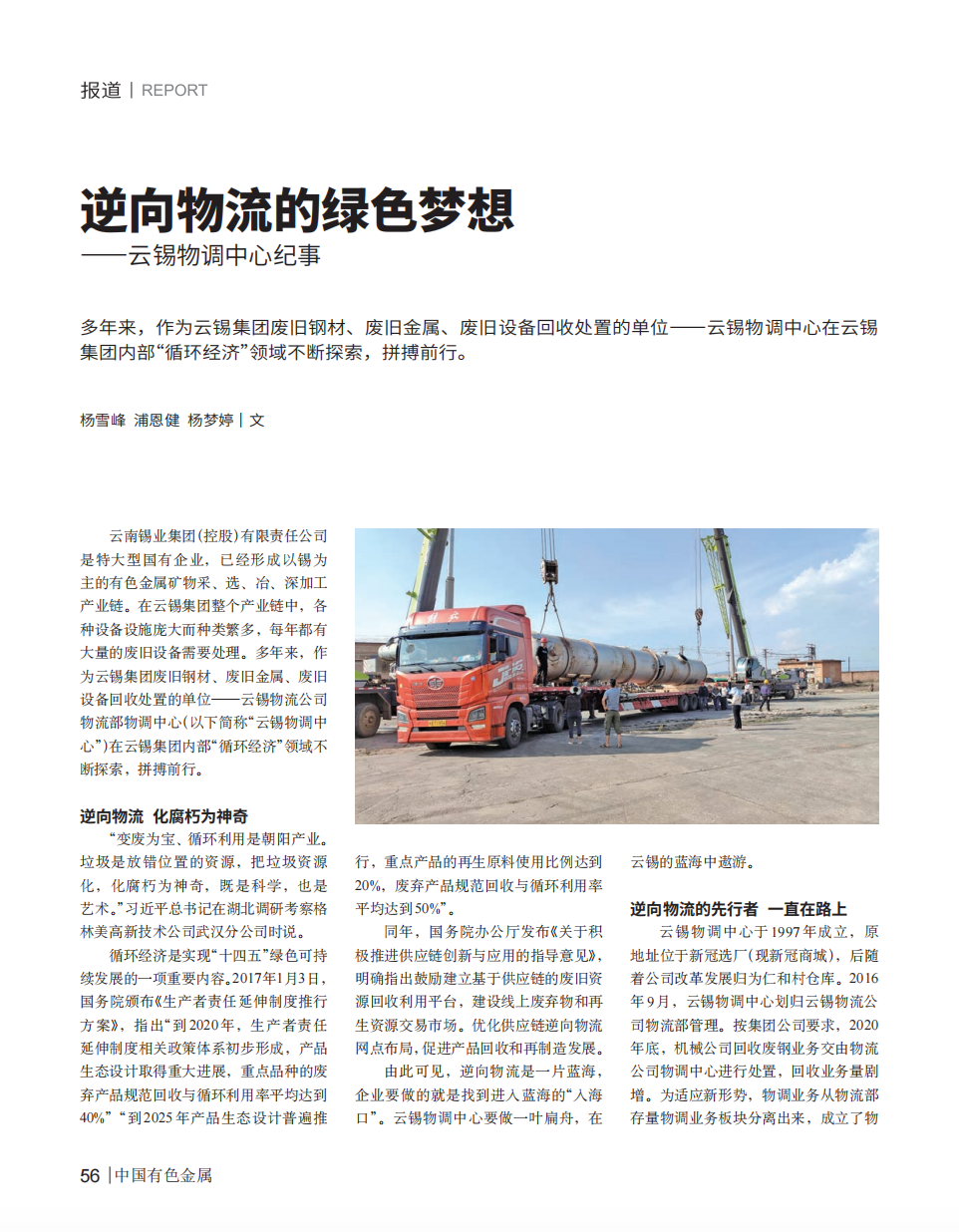 中國有色金屬雜志:逆向物流的綠色夢(mèng)想——云錫物調(diào)中心紀(jì)事