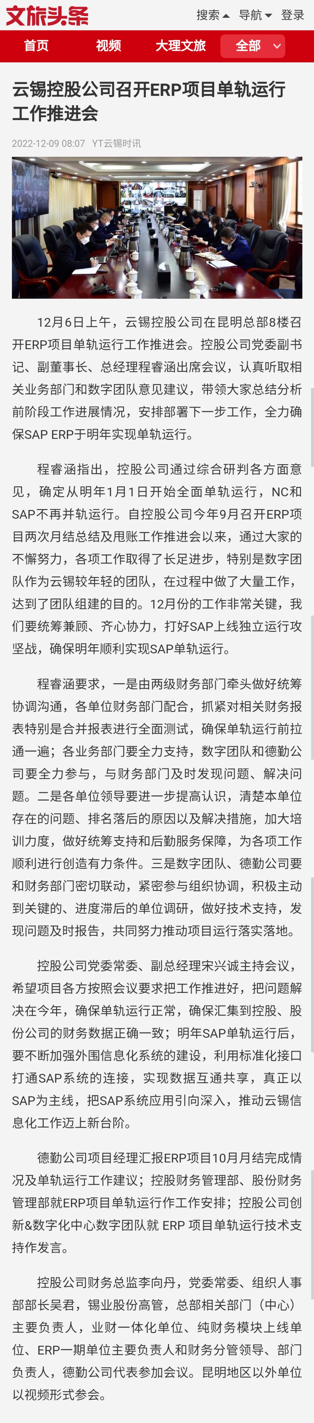 文旅頭條:云錫控股公司召開(kāi)ERP項(xiàng)目單軌運(yùn)行工作推進(jìn)會(huì)