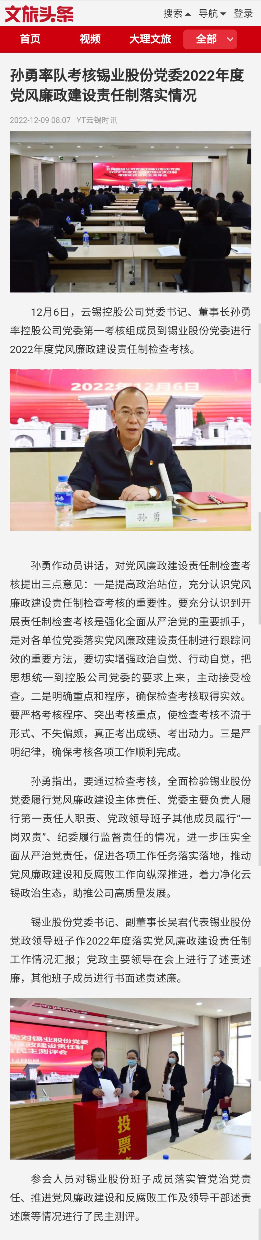 文旅頭條:孫勇率隊考核錫業(yè)股份黨委2022年度黨風(fēng)廉政建設(shè)責(zé)任制落實情況
