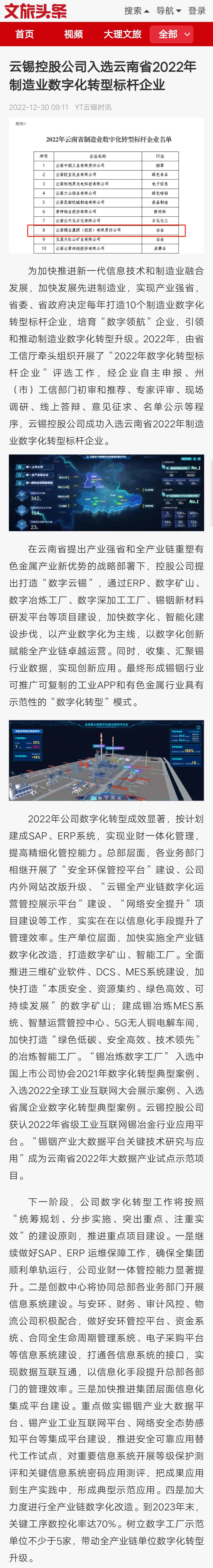 文旅頭條:云錫控股公司入選云南省2022年制造業(yè)數(shù)字化轉(zhuǎn)型標(biāo)桿企業(yè)