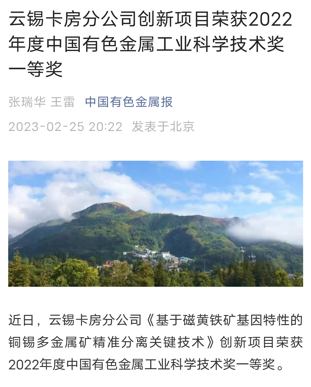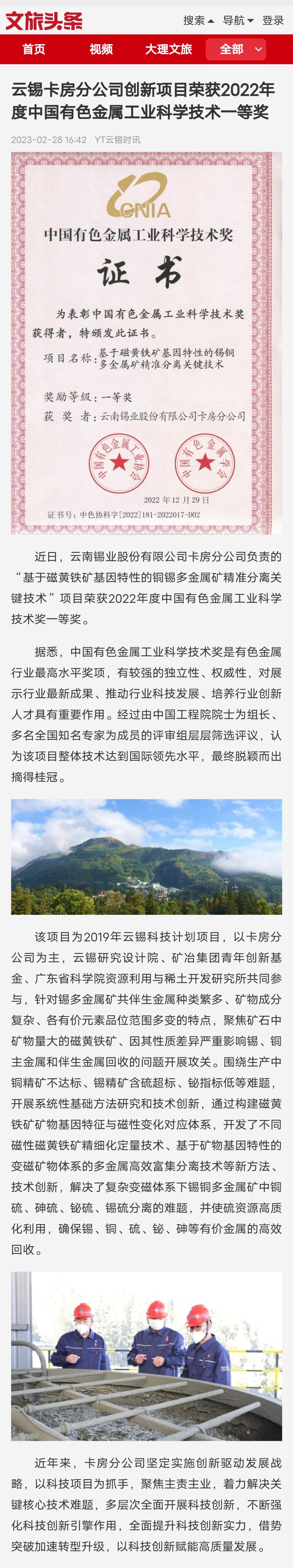云南政協報、中國有色金屬報、文旅頭條:云錫卡房分公司創新項目榮獲2022年度中國有色金屬工業科學技術一等獎