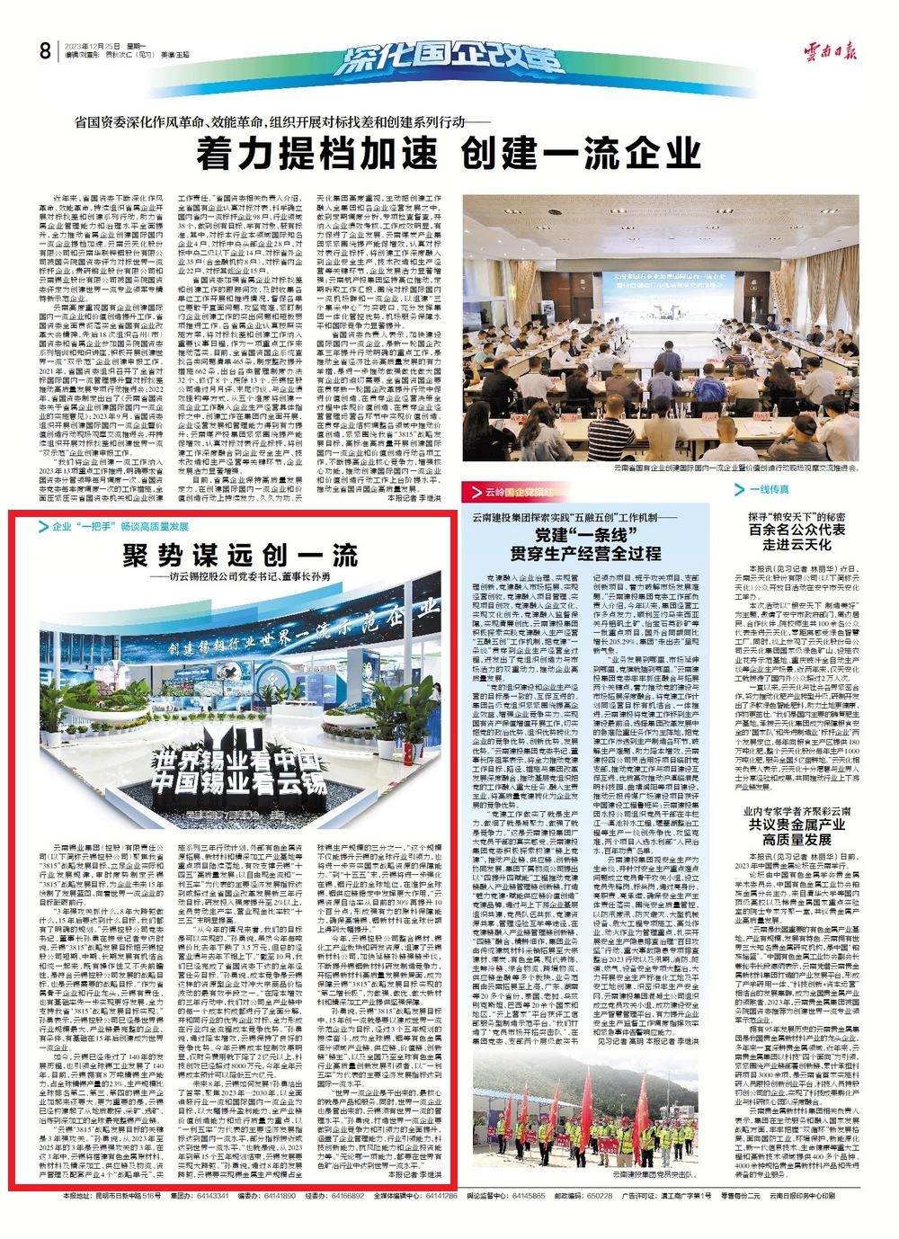 “云錫‘3815’戰略發展目標的關鍵是3年強攻關。”孫勇說,從2023年至2025年的3年是云錫強攻關的3年。在這3年中,云錫將搭建有色金屬原材料、新材料及精深加工、供應鏈及物流、資產管理及配套產業4個“戰略單元”,實施系列三年行動計劃,外部有色金屬資源拓展、新材料和精深加工產業基地等重點項目陸續落地,有效支撐云錫“十四五”高質量發展;以自由現金流和“一利五率”為代表的主要經濟發展指標達到或超過全省國企改革發展新三年行動目標,研發投入強度提升至2%以上,全員勞動生產率、營業現金比率較“十三五”末明顯提高。