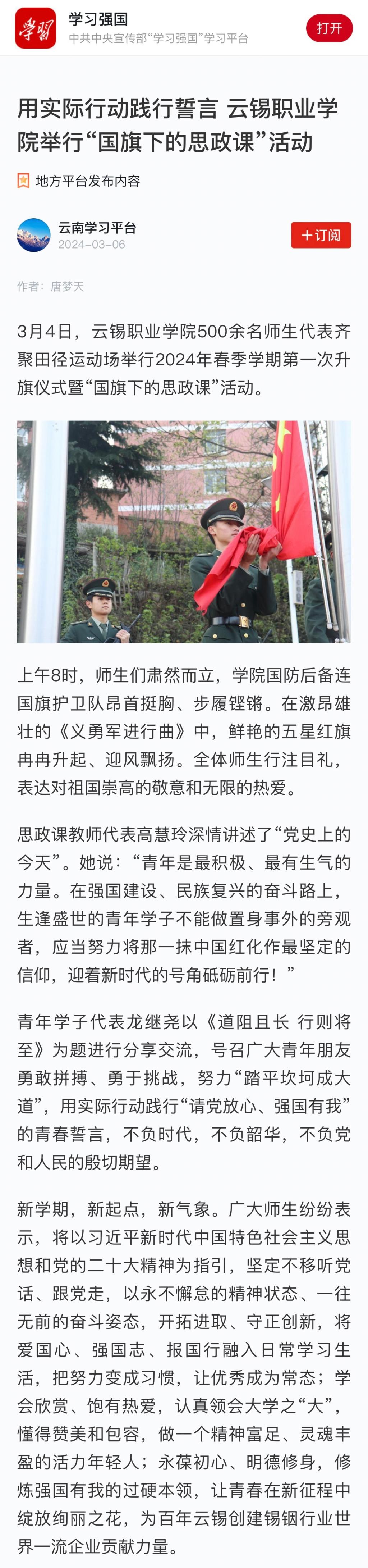 學(xué)習(xí)強(qiáng)國:用實(shí)際行動踐行誓言 云錫職業(yè)學(xué)院舉行“國旗下的思政課”活動