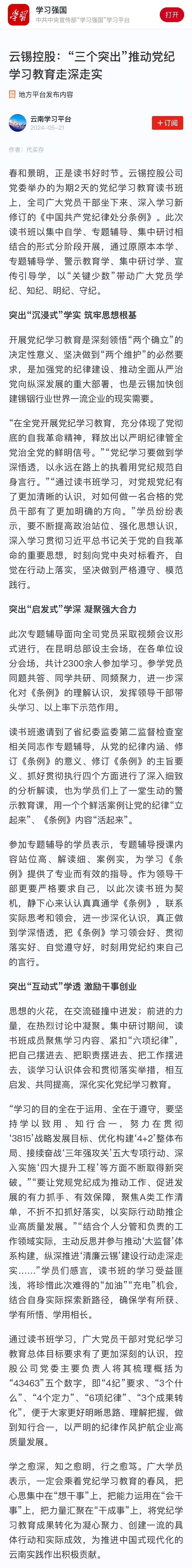 學習強國:云錫“三個突出”推動黨紀學習教育走深走實